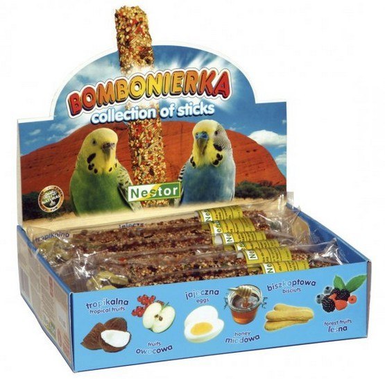 Bombonierka dla małych papug to zestaw 12 kolb w 6 smakach:
