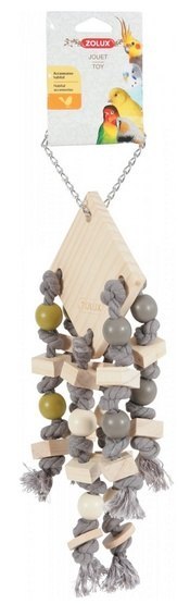 Zabawka do zawieszenia to idealny dodatek do klatki dla ptaków. Do jej produkcji użyto elementów drewnianych, kolorowych sznurków oraz koralików. Zabawka posiada metalowy łańcuszek z praktycznym karabińczykiem, dzięki czemu można ją przymocować do prętów klatki. Produkt nie tylko dostarcza zwierzęciu rozrywki, ale także stymuluje je intelektualnie i urozmaica przestrzeń klatki.